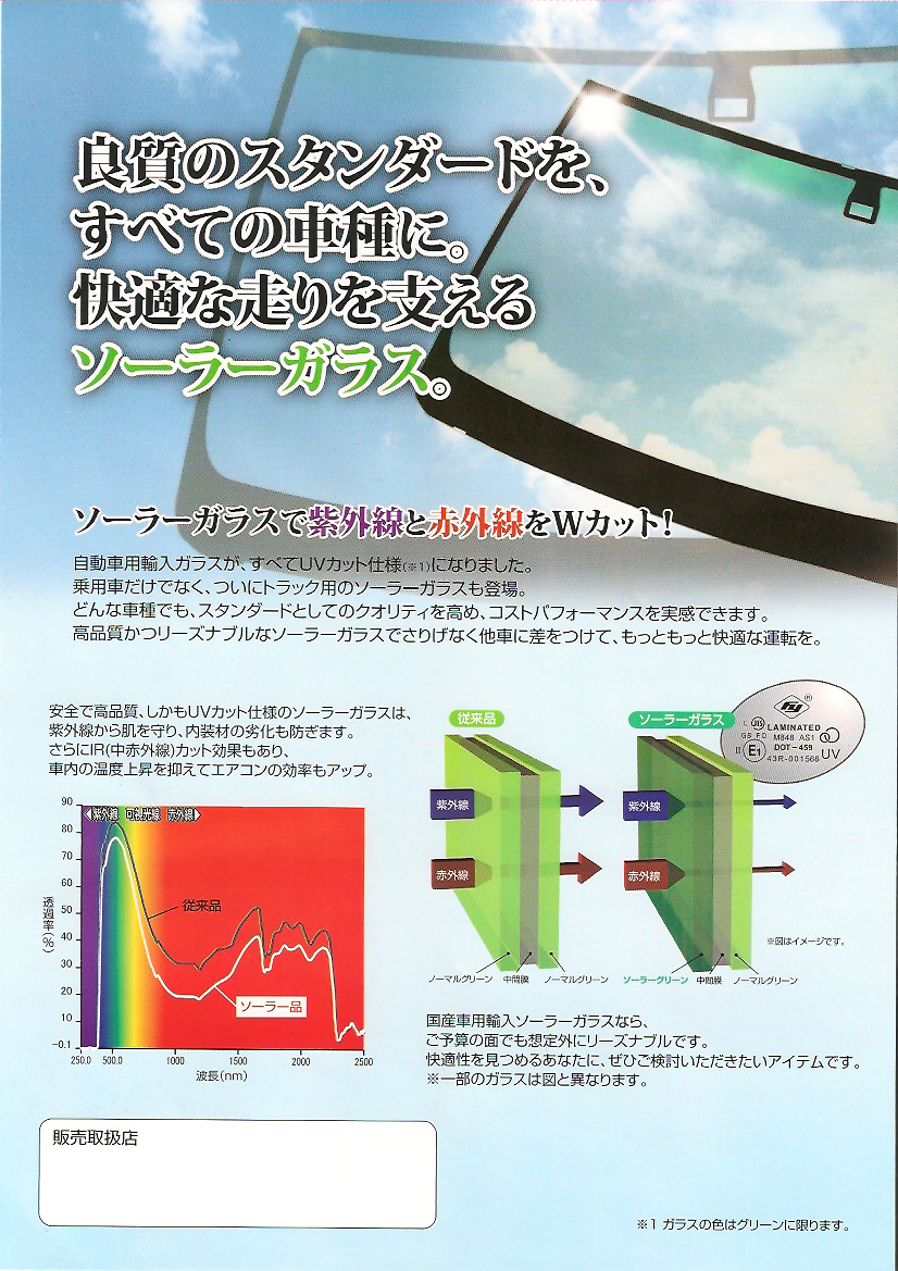 輸入ガラス(海外製ガラス)が心配 そんなお客様に お勧めしたいガラスです 性能、機能は純正ガラスと同等といわれていますが 純正ガラスではない以上 なにごとも過度の期待は禁物です