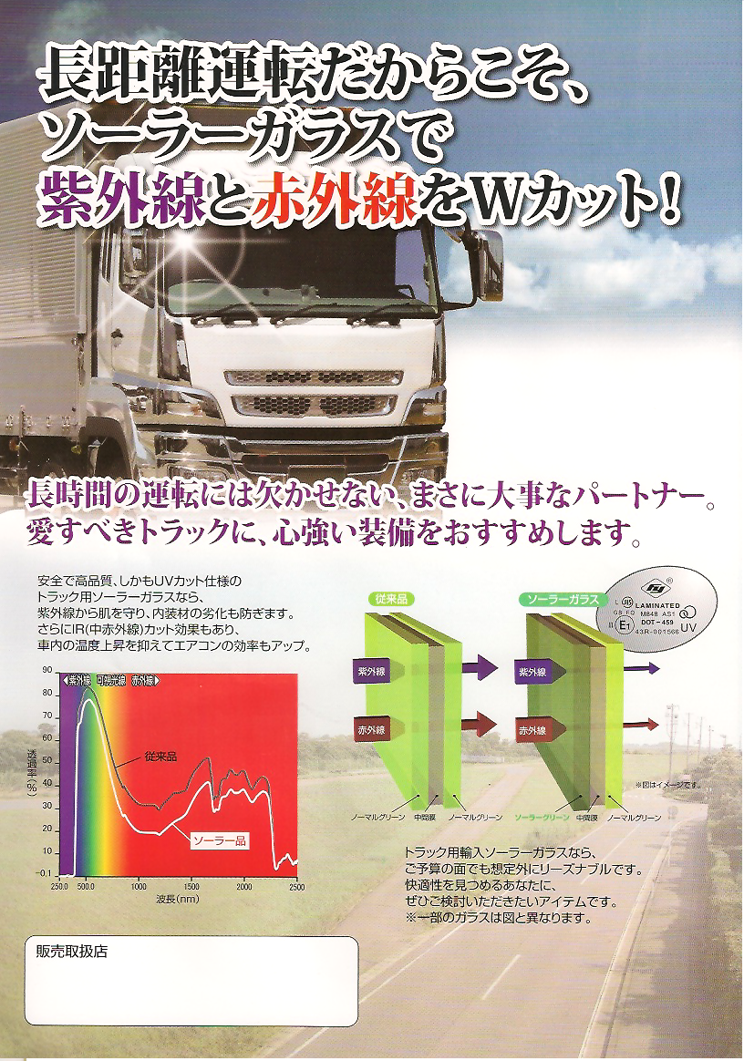 日本の技術を導入し 海外で製造したガラスです 対向車のLEDライト夜間の信号など まぶしさ軽減効果あり 中間膜に断熱シート採用! UVカット機能にプラスして IR(赤外線)をハードにカット