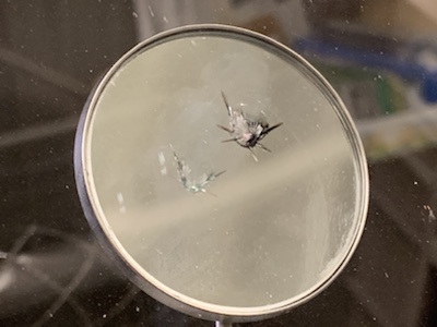 完全にキズが見えなくなる 訳ではありません レジンという透明な接着剤を浸透させ 透明にぼかす作業です キズ中央の衝撃点は残ります だいたい手の親指の爪の大きさより隠れるくらいが 修理の範囲内です 100%強度は戻りません だいたい70%~80%ぐらいの強度ぐらいです キズからヒビが伸びてしまいましたら ガラス交換になってしまいますので いち早くリペア修理を決断しましょう