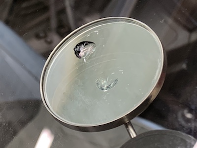 完全にキズが見えなくなる 訳ではありません レジンという透明な接着剤を浸透させ 透明にぼかす作業です キズ中央の衝撃点は残ります だいたい手の親指の爪の大きさより隠れるくらいが 修理の範囲内です 100%強度は戻りません だいたい70%~80%ぐらいの強度ぐらいです キズからヒビが伸びてしまいましたら ガラス交換になってしまいますので いち早くリペア修理を決断しましょう