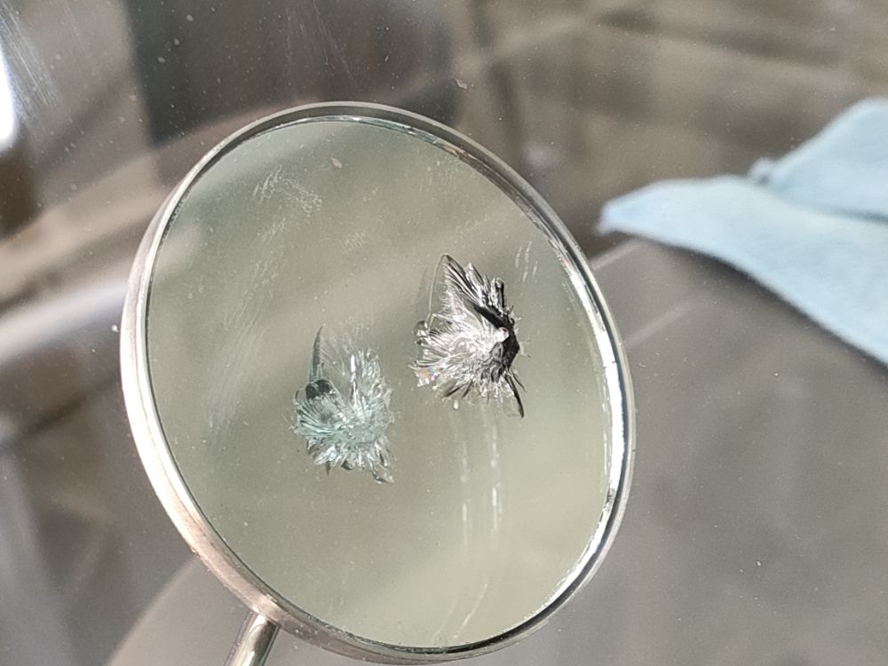 完全にキズが見えなくなる 訳ではありません レジンという透明な接着剤を浸透させ 透明にぼかす作業です キズ中央の衝撃点は残ります だいたい手の親指の爪の大きさより隠れるくらいが 修理の範囲内です 100%強度は戻りません だいたい70%~80%ぐらいの強度ぐらいです キズからヒビが伸びてしまいましたら ガラス交換になってしまいますので いち早くリペア修理を決断しましょう