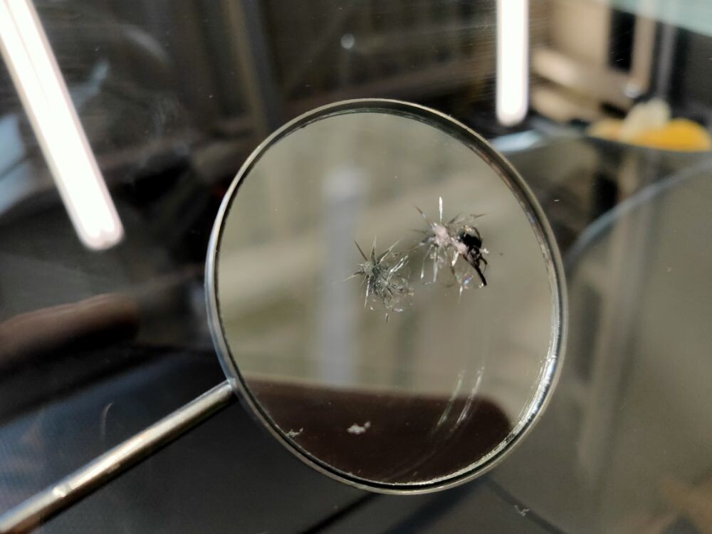 完全にキズが見えなくなる 訳ではありません レジンという透明な接着剤を浸透させ 透明にぼかす作業です キズ中央の衝撃点は残ります だいたい手の親指の爪の大きさより隠れるくらいが 修理の範囲内です 100%強度は戻りません だいたい70%~80%ぐらいの強度ぐらいです キズからヒビが伸びてしまいましたら ガラス交換になってしまいますので いち早くリペア修理を決断しましょう